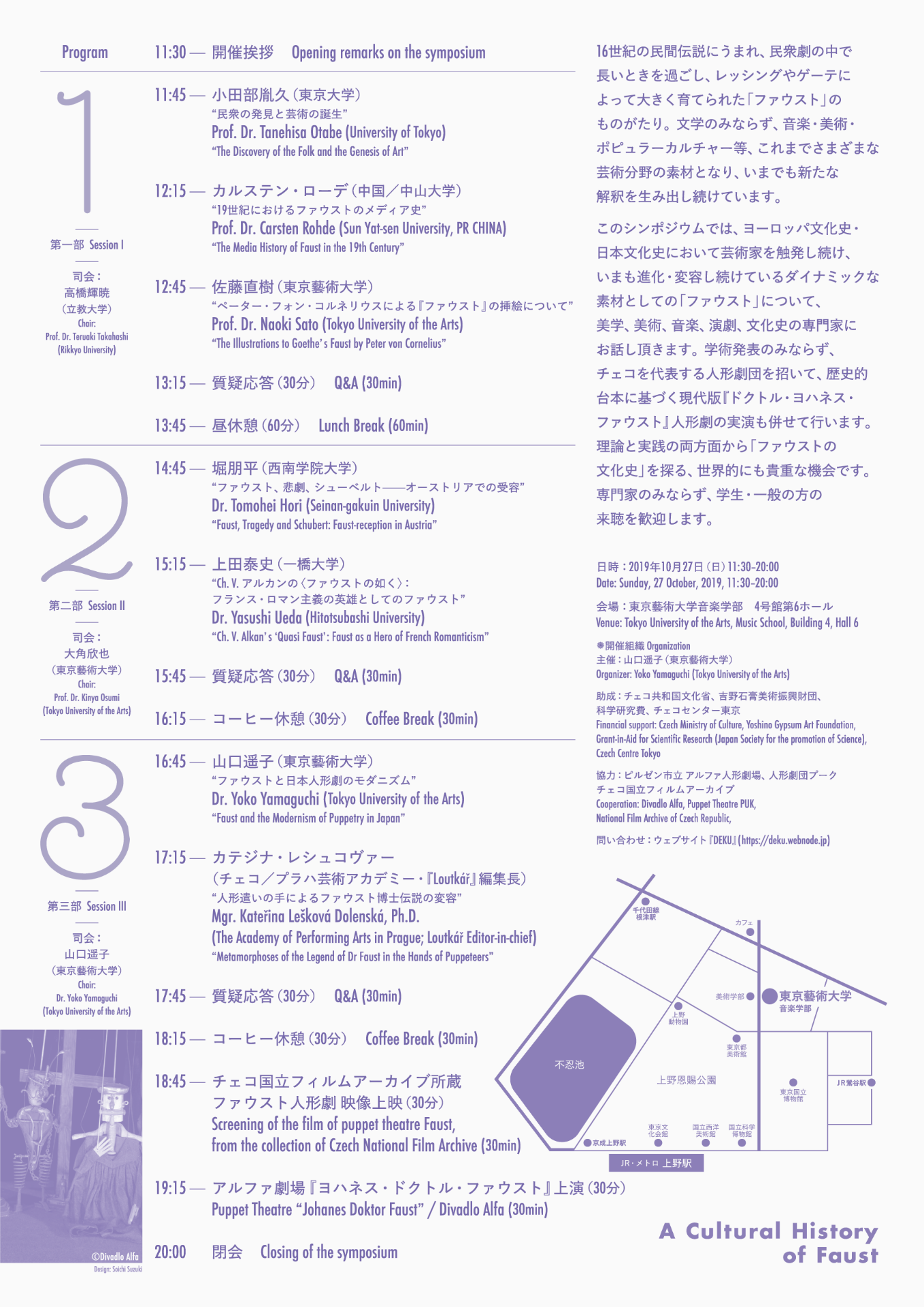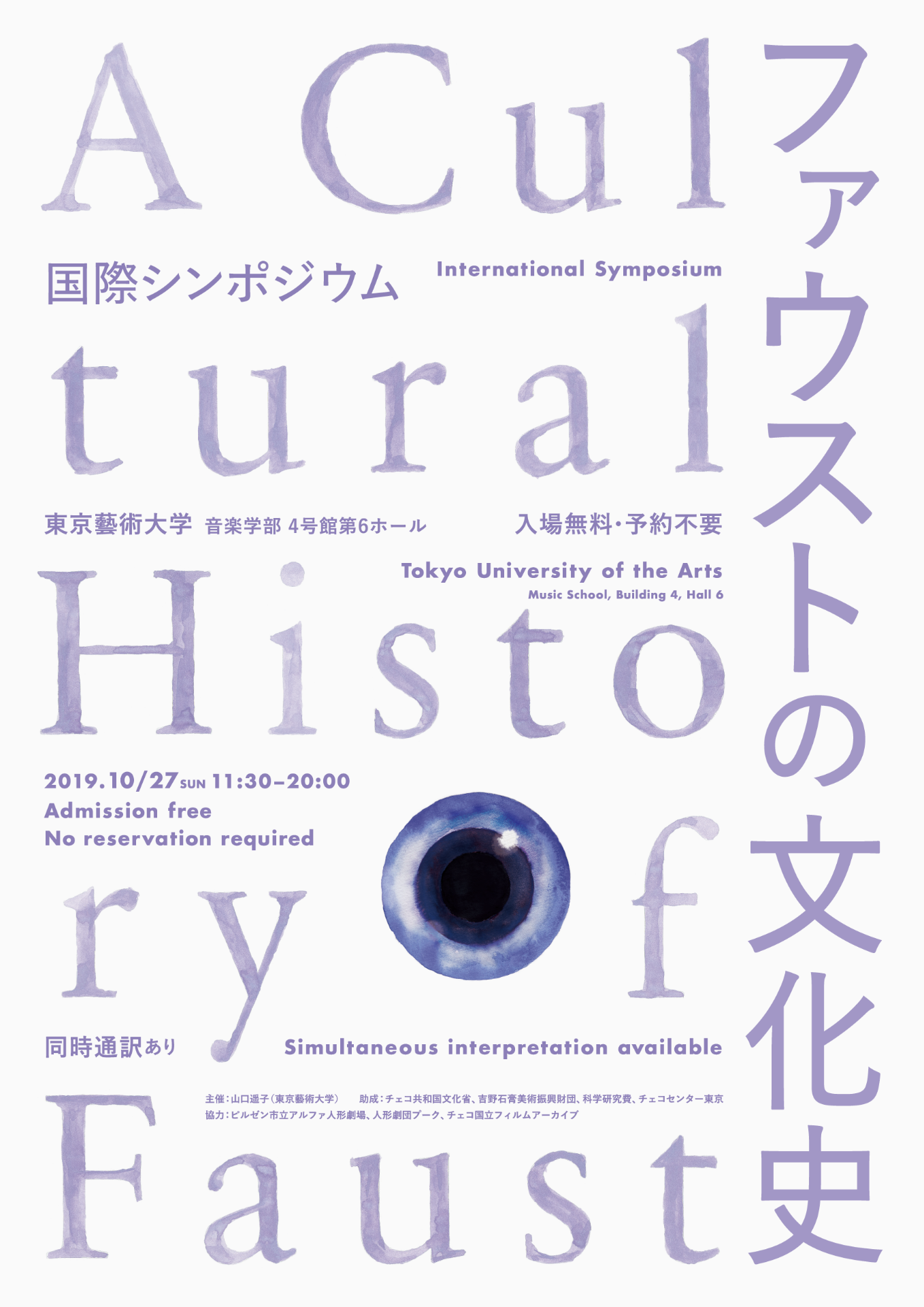 東京藝大という会場条件を鑑み、学生や一般来場者のより多い参加を期して、シンポジウム中は発表・討議時間ともに同時通訳を設置する。学術発表に併せ、チェコを代表する人形劇団を招いてファウスト人形劇の実演も併せて行う。理論と実践の両方面から『ファウスト』の文化史を探る、世界的にも貴重な学術集会となるだろう。